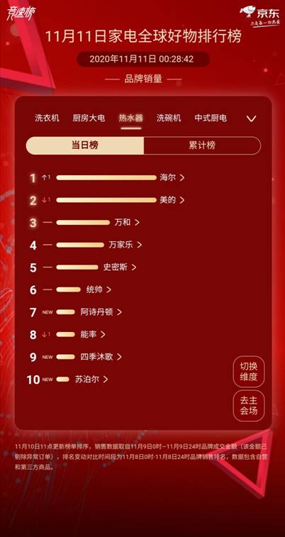 據(jù)京東家電全球好物排行榜數(shù)據(jù)顯示,截至11日0點(diǎn)28分,海爾熱水器當(dāng)日品牌銷(xiāo)量居TOP1,累計(jì)榜單中,海爾熱水器也處于領(lǐng)先位置,成為用戶(hù)的首選品牌。