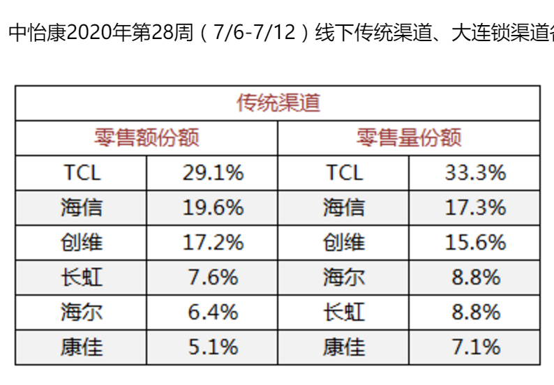 中怡康:TCL電視零售量零售額線下雙雙第一