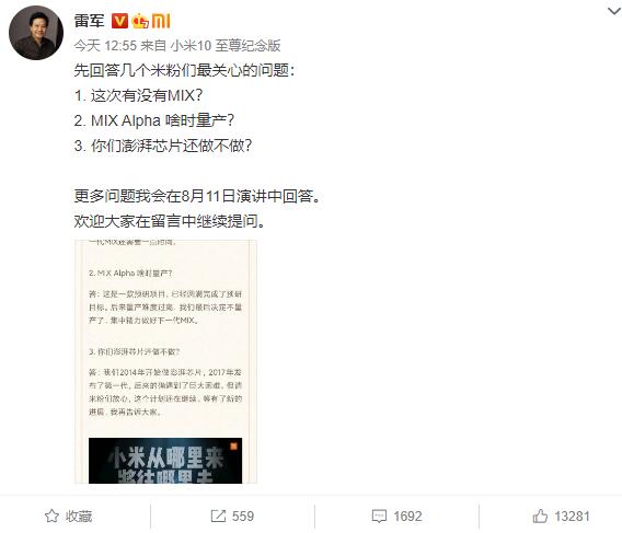 另一個(gè)米粉關(guān)心的話(huà)題“小米MIX Alpha"的話(huà)題,雷軍表示,小米MIX α是一款預(yù)研項(xiàng)目,已經(jīng)圓滿(mǎn)完成了預(yù)研目標(biāo)。后來(lái)量產(chǎn)難度過(guò)高,最后決定不量產(chǎn)了,集中精力做好下一代MIX。