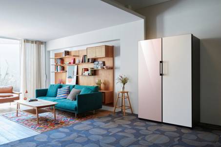 據了解,三星BESPOKE系列冰箱有光暈粉、勃艮第紅、皎月白、海軍藍等9種顏色,有粉體金屬、啞光玻璃和亮面玻璃3種材質,還有窄體單門、單門和雙門3種型號。消費者可以選擇不同顏色、材質的冰箱進行組合設計。