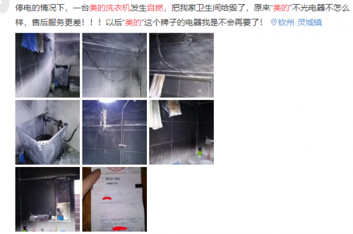 有廣西欽州消費(fèi)者投訴稱,停電的情況下,一臺(tái)美的洗衣機(jī)發(fā)生自燃,把我家衛(wèi)生間給毀了,原來(lái)“美的”不光電器不怎么樣,售后服務(wù)更差!!!以后“美的”這個(gè)牌子的電器我是不會(huì)再要了!