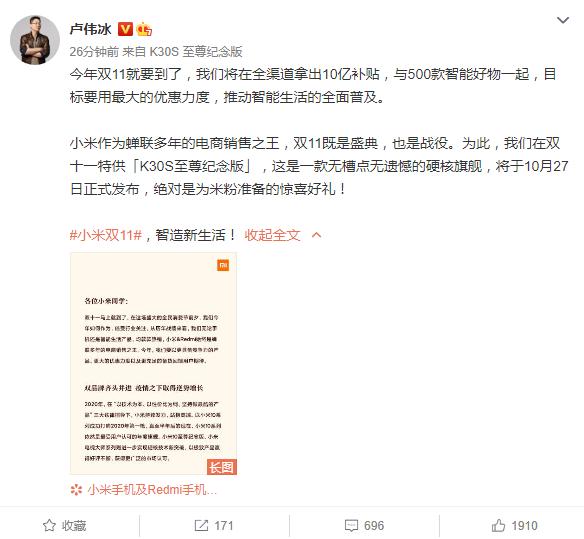 小米發布特供雙11手機Redmi K30S至尊版 補貼10億鏖戰雙11