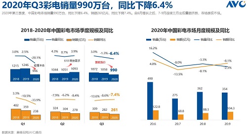 家電消費網(wǎng)10月27日訊 今天,大數(shù)據(jù)公司奧維云網(wǎng)發(fā)布的第三季度國內彩電市場報告顯示,中國彩電市場依然是量額齊跌。其中彩電銷量990萬臺,同比下降6.4%,銷銷額261億元,同比下降7.4%。