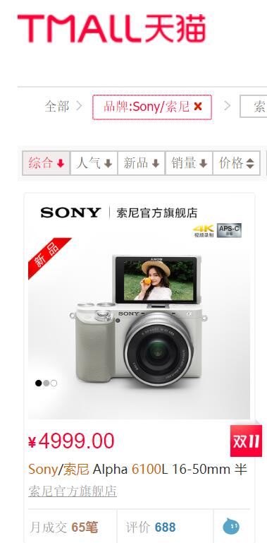 今天家電消費網登陸天貓看到索尼6100套機銷量為65臺。(杜佳)