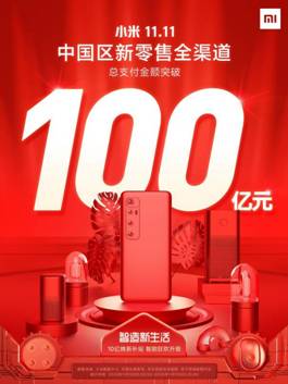 家電消費網11月11日訊    今天11月1日-11月11日凌晨3點25分,小米集團中國區新零售全渠道總支付金額突破100億元,超越去年小米雙十一的銷售額記錄。