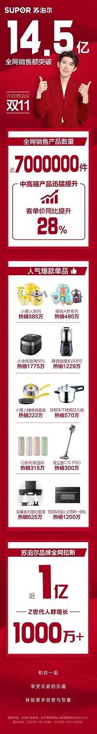 監測數據顯示,經過今年雙十一一役,蘇泊爾品牌新增圈粉人數一億人,其中95后新增超過1000萬人。