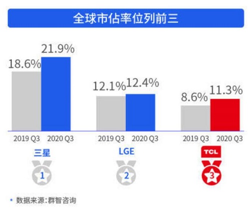 家電消費網11月18日訊 2020年第三季度,TCL品牌電視機銷售量達724萬臺,同比增長49.7%,環比增長24.7%。根據群智咨詢的最新報告,2020年第三季度TCL品牌電視機銷售量市占率由去年同期的8.6%同比提升2.7個百分點提升至2020年第三季度的11.3%,排名穩居全球前三。