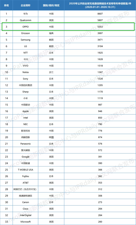2020年全球無線通信網絡技術發明專利排行:OPPO位居全球第三