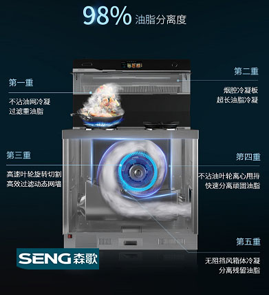 爆炒產(chǎn)生的油煙,對人體有著巨大的危害。拒絕外賣,追求品質(zhì)生活的我們,同樣也不能容忍油煙對我們的皮膚、肺、呼吸系統(tǒng)造成傷害。森歌i8智能蒸烤集成灶的油煙機(jī)采用的變頻巡航大風(fēng)壓,可以根據(jù)我們居住的樓層高度和動態(tài)油煙流量智能增壓,16.5m³/min大風(fēng)量,1000Pa靜壓值,足以讓開放式廚房也可以實(shí)現(xiàn)爆炒自由。