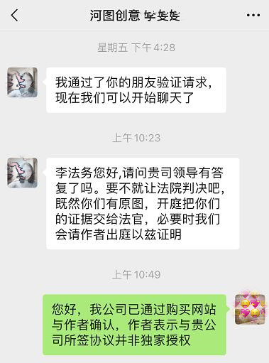 “我們公司有購買圖片公司出具的證明,我們不會和河圖創意私下和解,一定要對簿公堂。在法庭上,我會代表公司反訴河圖創意詆毀我們公司商業信譽。”