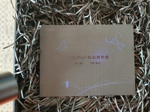 打開紫光燈,照射黑色邀請函,就可以看到邀請函上方出現(xiàn)了熠熠閃光的繁星,并清晰寫有“X60 Pro+新品發(fā)布會 1月21日 19:30”的字樣。這意味著有超大杯之稱的vivo X60 Pro+在拍照上更加精進。