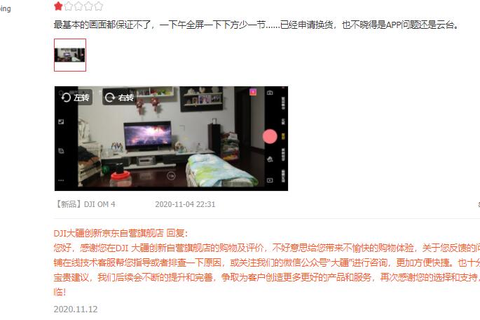 有購買大疆手持云臺的消費者表示,“最基本的畫面都保證不了,一下午全屏一下下方少一節……已經申請換貨,也不曉得是APP問題還是云臺。”