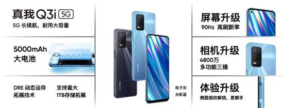 真我Q3i配備了6.5英寸1080P單挖孔顯示屏,支持90Hz屏幕刷新率和180Hz操控采樣率;機身厚度為8.5毫米,重量輕至185克;背面采用了3D曲面后蓋設計,共推出了光影藍和粒子灰兩種配色;后置4800萬像素三攝鏡頭,內置5000毫安時大容量電池,預裝realme UI2.0版本,搭載聯發科7nm天璣700 5G處理器,4+128GB 售價999元、6+128GB 售價1099元。