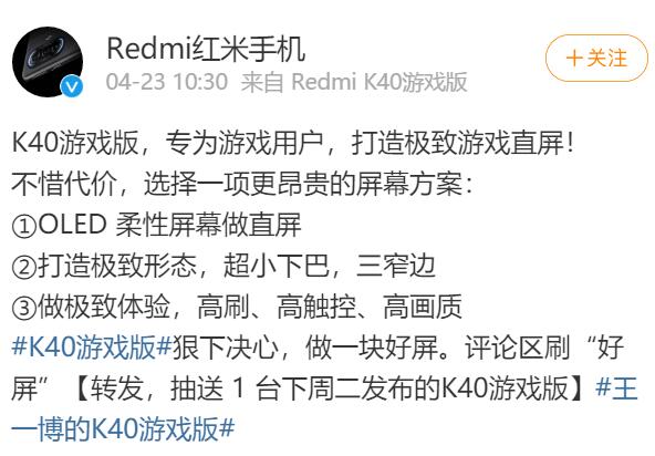 導讀:  家電消費網4月23日訊 狠下心,做一塊好屏。今日,Redmi紅米手機在官方微博上透露,RedmiK40游戲版專為游戲用戶打造,打造極致游戲直屏。  紅米表示,Redmi紅米手機選擇更昂貴的屏幕方案:一是采用OLED柔