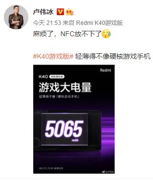 家電消費網4月25日訊 Redmi K40游戲增強版沒有NFC功能。今日晚間,Redmi總裁在微博上表示,“麻煩了,NFC放不下了。”
