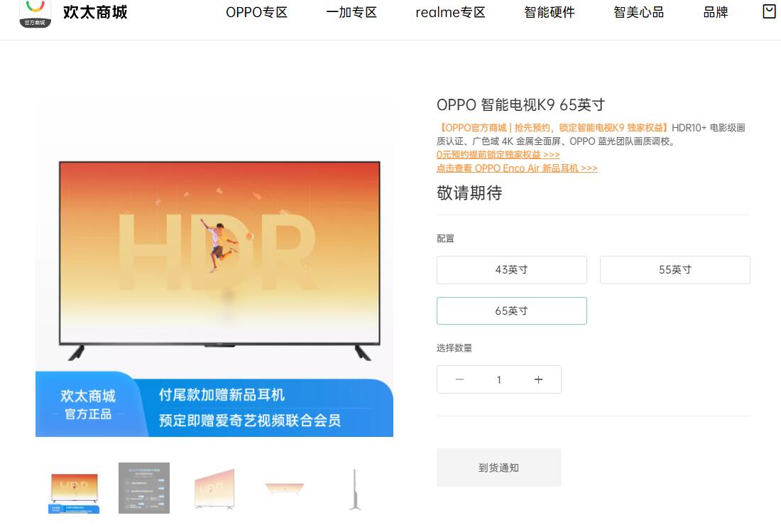 今天,家電消費網登陸OPPO官方商城,看到預約中的OPPO智能電視K9有三款尺寸,分別是43、55和65英寸。