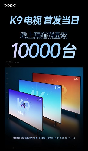 家電消費網5月19日訊 昨天,是OPPO智能電視K9首銷的日子。今天,OPPO在微博上宣布,首銷當時,OPPO智能電視K9線上渠道銷量已突破一萬臺。