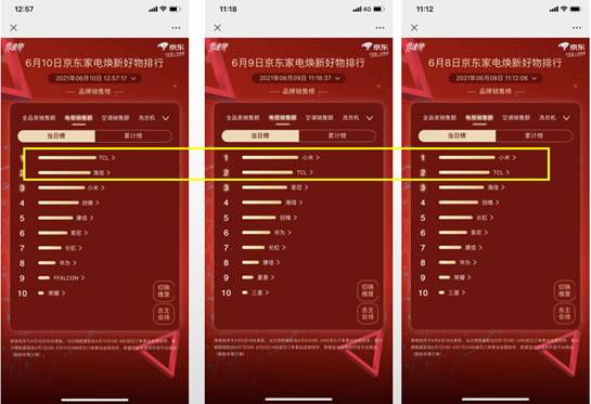 家電消費網6月10日訊 今天是京東618家電品類日,也正是今年618年中大促賽程過半。家電消費網獲悉,電視品類中一直占據銷售第一的小米排名突然回落至第三,而一直在第二名位置上蟄伏的TCL上位沖到了榜首。