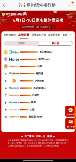 導讀:  家電消費網6月11日訊 昨天,618賽程已過半,蘇寧易購悟空榜的監測數據顯示,6月1日-10日0點,頭部品牌在蘇寧全渠道銷售暴增,美的、海爾、九陽占據品牌銷量榜前三席位。  隨著氣溫攀升,空調銷售一騎絕塵