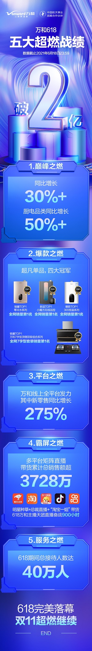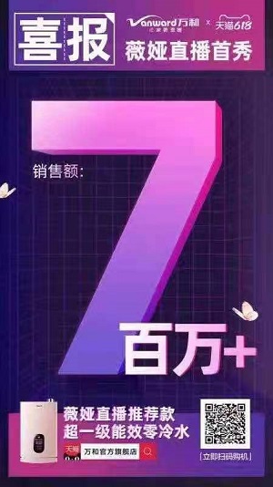 對此,萬和電氣董事兼總裁盧宇聰表示,今年618期間,萬和電氣采取了明星種草+總裁直播+“淘寶一姐”帶貨的新型線上營銷方式,618萬和主播天團直播奮戰900小時,多平臺矩陣直播帶貨累計總銷售額超3728萬元。其中,薇婭直播推薦款的萬和超一級能效零冷水在天貓萬和官方旗艦店銷售額超7百萬元。