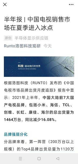 導(dǎo)讀: 家電消費網(wǎng)7月15日訊 今天,洛圖科技(RUNTO)發(fā)布的《中國電視市場品牌出貨月度追蹤》報告中顯示:2021年上半年,中國大陸前7大國產(chǎn)電視品牌,包括小米、海信、TCL、創(chuàng)維、長虹、康佳、海爾的總出貨量為14