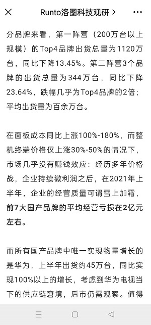 洛圖分析師認為,在面板成本同比上漲100%-180%,而整機終端價格僅上漲30%-50%的情況下,市場幾乎沒有賺錢效應(yīng):經(jīng)歷多年價格戰(zhàn),企業(yè)持續(xù)微利潤之后,在2021年上半年,企業(yè)的經(jīng)營質(zhì)量可謂雪上加霜,前7大國產(chǎn)品牌的平均經(jīng)營虧損在2億元左右。
