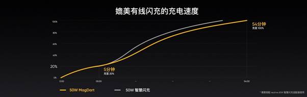 真我50W MagDart磁吸無線閃充配備了一個主動式風冷散熱系統,通過一個小巧且強大的風扇,將大量氣流引入配適器進行快速散熱,將主板和線圈的溫度保持在正常水平,使得充電器能長時間維持高功率充電。真我50W MagDart磁吸無線閃充實測的充電效率,達到了MagSafe的8倍。
