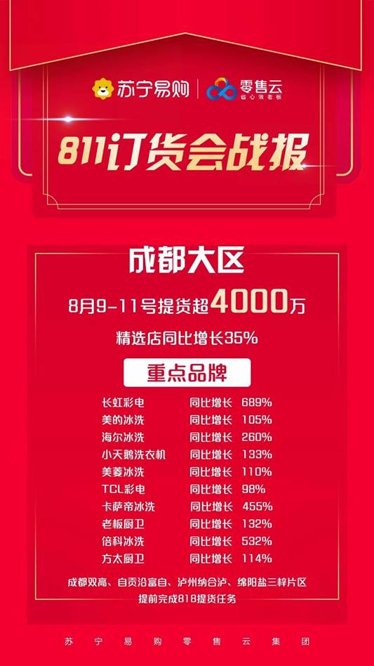 在下沉市場,蘇寧易購與品牌商深化合作。蘇寧易購零售云811訂貨會數據顯示,眾多合作的品牌銷售額實現穩步增長。長虹銷售額同比增長593%,小天鵝銷售額同比增長100%。其中,合肥、成都大區銷售額超4000萬,山西大區超2500萬。空調、冰洗、彩電、廚衛等品牌增長強勁,在訂貨會上深受零售云老板熱捧。
