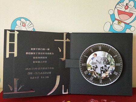 邀請函用素雅的牛皮紙包裹,打開后里面是一個黑色的硬殼“相冊”。封面上刻印著拆分的“時光”二字。翻開“相簿”,第一頁上寫有“蔡司影像 品閱時光”字樣。第二頁左側(cè)寫有“在按下快門的一刻 我們擁有了留住時光的能力 定格如畫瞬間 記錄動人美好 vivo X70系列新品發(fā)布會 邀您一起共同品閱時光 9月9日 19:30”。右側(cè)是一個展開式表盤設(shè)計。