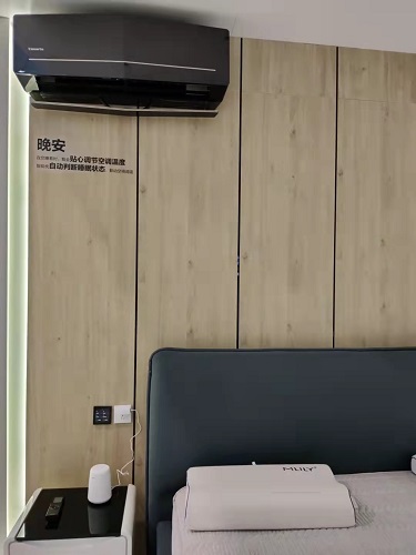 三翼鳥臥室里面,卡薩帝智能空調通過和頭枕的互聯互動,不僅能主動監測睡眠狀態調節溫濕度,還可以調整室內溫度。