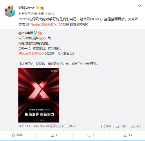 隨后,小米集團高級副總裁張峰在微博上表示,Redmi 電視最大的對手可能是我們自己。繼普及 MEMC、金屬全面屏后,大家希望看到 Redmi 智能電視 X 2022 款有哪些突破?