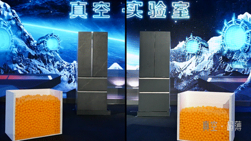 為了更加形象地展示出海信真空·超薄冰箱“占地少一成,容積多一半”的效果,林朝暉選取了兩臺同樣尺寸并裝滿乒乓球的冰箱,一臺是普通冰箱,一臺是海信真空·超薄冰箱。實驗結果再一次見證了海信真空·超薄冰箱“同樣尺寸,容量更大”的效果,實現了行業最大容積率58%的奇跡。
