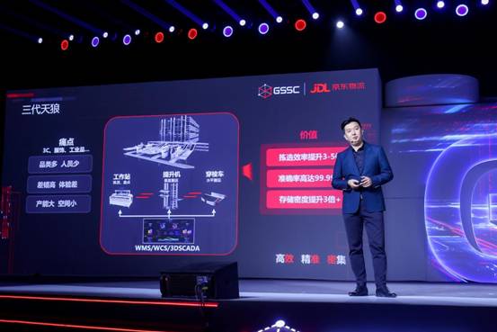 王強透露,京東第三代天狼系統以其高效、精準、密集存儲的優勢,面向貨到人揀選、線邊存取、合流緩存自動化三大場景,廣泛適用于3C電子、工業品、服飾、醫藥、汽車等眾多行業, 并于2020年完成3C電子行業首套超過19米高的天狼系統交付。