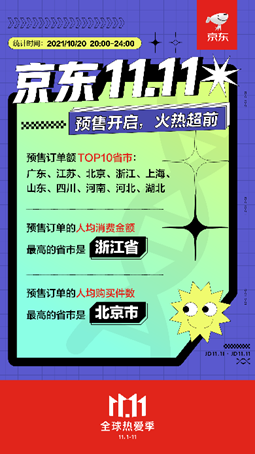 預售4小時內,預售訂單額TOP10省市分別為廣東、江蘇、北京、浙江、上海、山東、四川、河南、河北、湖北。其中,預售訂單的人均消費金額最高的省市是浙江省;預售訂單的人均購買件數最高的省市是北京市。預售訂單額TOP10品類分別為電腦整機、大家電、手機、運動鞋包、面部護膚、廚衛大電、生活電器、攝影攝像、廚房衛浴。