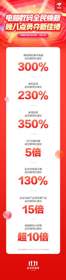 導讀: 家電消費網10月31日訊 今日晚間8點,京東11 11全球熱愛季正式啟動。開場僅10分鐘,高刷屏輕薄本電腦成交額同比增長300%,家用投影成交額同比增長350%!