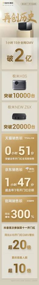 家電消費網(wǎng)11月1日訊 極米科技截止11月1日1點15分全網(wǎng)成交金額(GMV)突破2億。