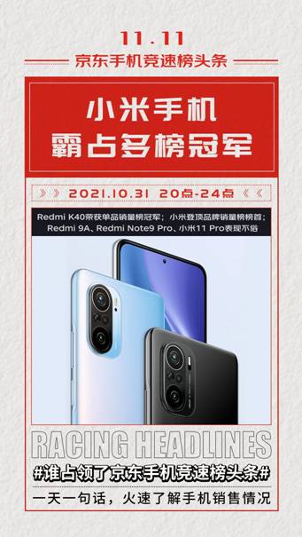 京東11.11首日手機競速榜發(fā)布:Redmi K40榮獲4小時銷量冠軍