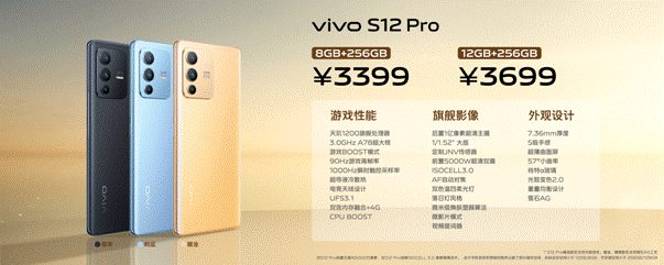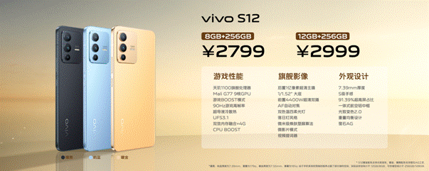 售價方面,vivo S12 Pro—8GB+256GB版本3399元,12GB+256GB版本3699元;vivo S12—8GB+256GB版本2799元,12GB+256GB版本2999元。