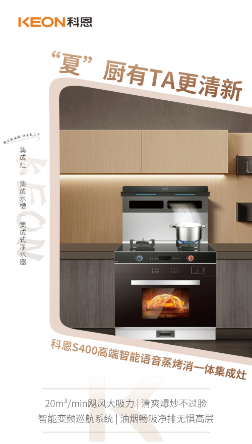 每一次下廚時的揮汗如雨,都是對愛的最好詮釋!科恩S400高端智能語音蒸烤消一體集成灶,20m³/min 颶風大吸力,720Pa大風壓,瞬吸惱人油煙,清爽爆炒不過臉,當熱浪遇見清風,悶熱煩躁一吹就散了,只留下如春風細雨般溫然如潤,智能變頻巡航系統,化身“斗暑圣戰士”,油煙暢吸凈排,無懼高層,烹飪高峰亦可游刃有余,于酷暑中守護家人的一日三餐!