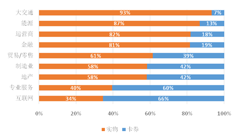分行業(yè)來看,互聯(lián)網(wǎng)、專業(yè)服務(wù)等行業(yè)企業(yè)相對(duì)更偏好靈活型的員工福利發(fā)放方式,更多選擇用禮品卡實(shí)現(xiàn)彈性福利。而交通、能源等相對(duì)傳統(tǒng)的行業(yè)的企業(yè)則更加看重福利的實(shí)用性,偏愛選擇實(shí)物類商品作為員工年貨福利。