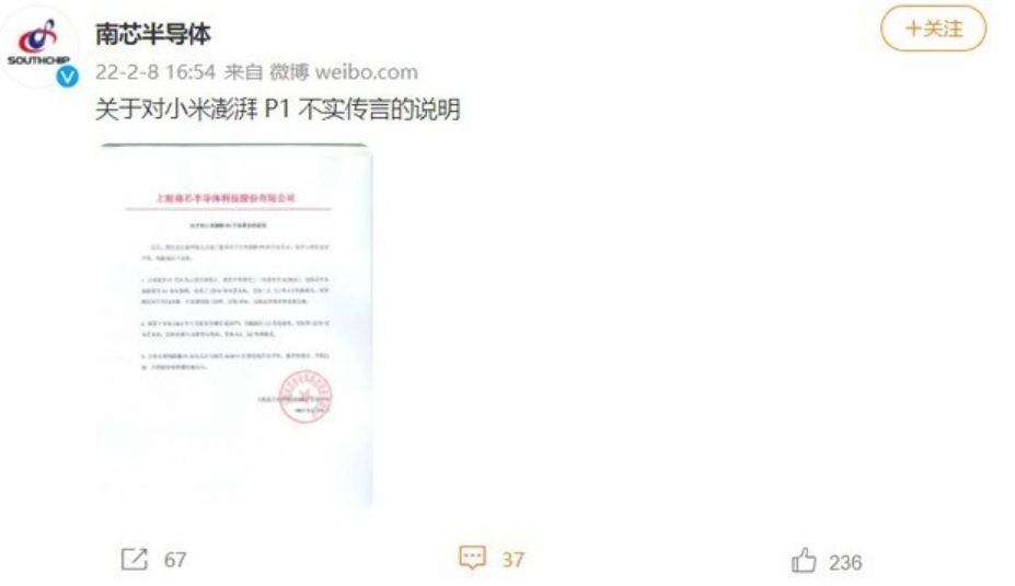 網(wǎng)傳小米澎湃P1芯片非自研 南芯半導(dǎo)體發(fā)聲明:不實(shí)傳言