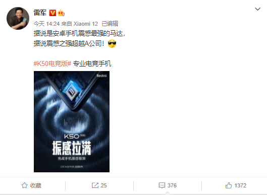 家電消費網2月15日訊 小米手機開始全面對標蘋果手機。今天,Redmi K50電競版為明天即將發布打出了寫有“振感拉滿 挑戰手機振感極限”的預熱海報。對此,今日下午,小米創始人雷軍在微博上再曝猛料:“據說是安卓手機震感最強的馬達,據說震感之強超過A公司!”