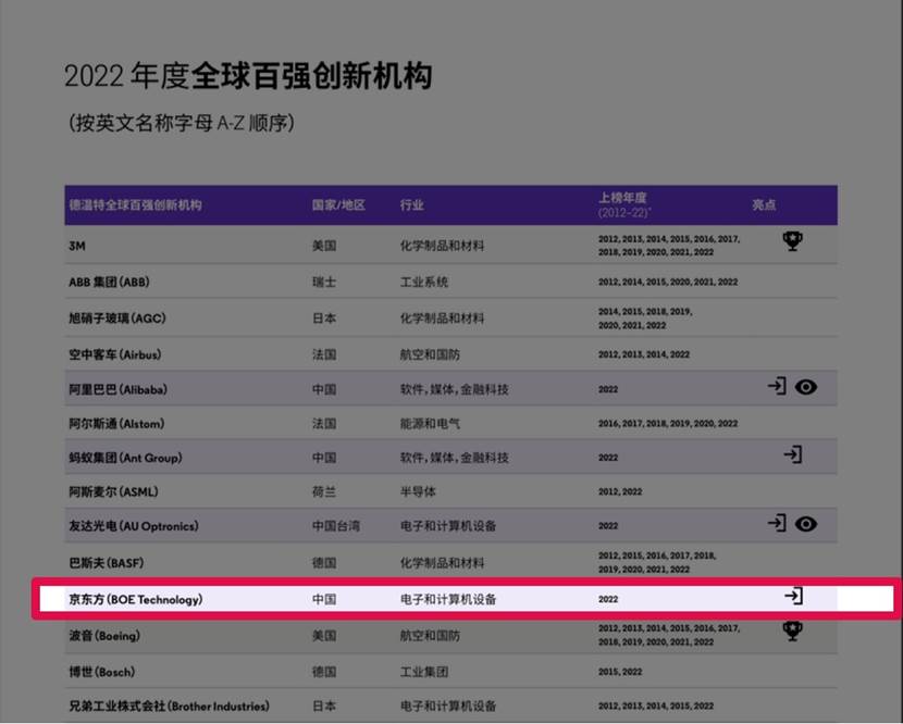 科睿唯安2022年全球百強創新機構榜單發布:京東方上榜