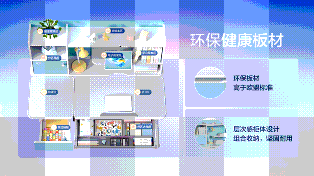 桌體部分材料使用環(huán)保板材,高于歐盟標(biāo)準(zhǔn),孩子使用更放心;桌面層次感柜體設(shè)計,組合收納,學(xué)習(xí)用具擺放更規(guī)整,堅(jiān)固耐用。貼心陪讀區(qū)設(shè)計,輕松享受親自好時光。