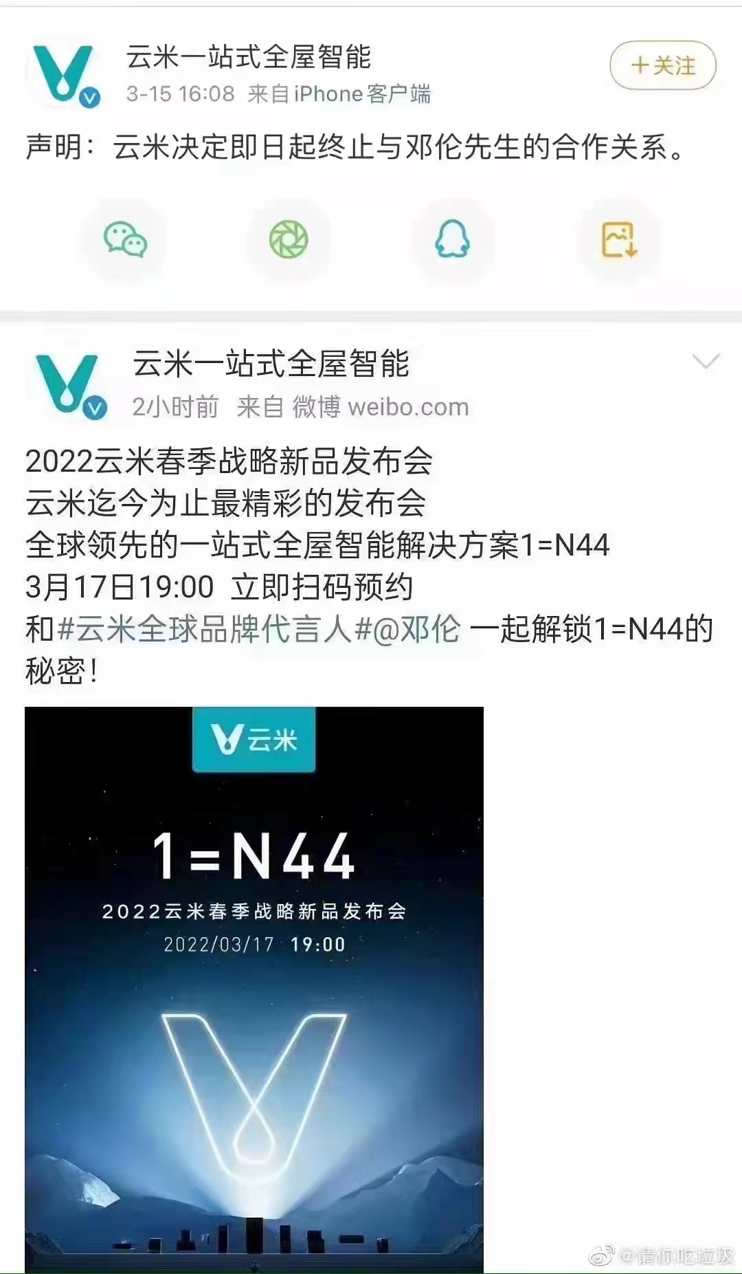 據了解,2021年9月,云米對外宣布鄧倫成為云米全球品牌代言人。今天上午,云米還對外宣布,鄧倫將參加其后天舉辦的新品發布會。