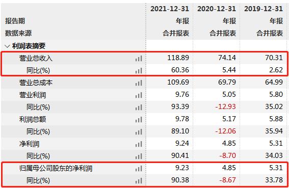 2019年-2021年,康冠科技的營業收入分別為70.31億元、74.14億元和118.89億元,同比增長率分別為2.62%、5.44%和60.36%;歸母凈利潤分別為5.31億元、4.85億元和9.23億元,同比增長率分別為33.78%、-8.67%和90.38%。