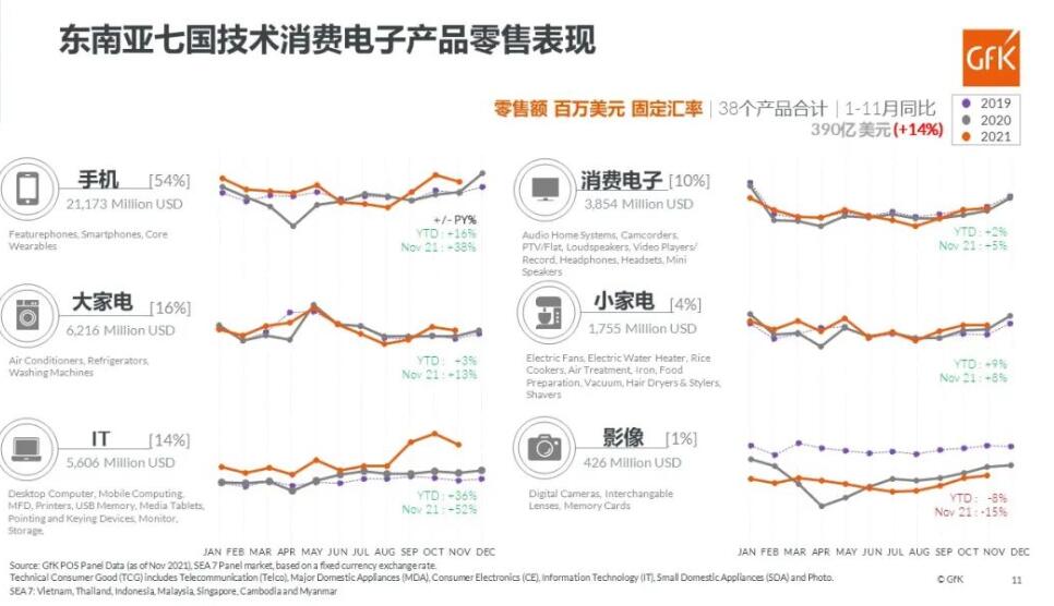 消費電子銷售方面,截至2021年11月,東南亞七國(包括越南、泰國、印度尼西亞、馬來西亞、新加坡、柬埔寨和緬甸)除影像產品外,其他大類都實現了銷售額同比增長,其中以IT產品表現最為搶眼,11月銷售額同比增長52%。