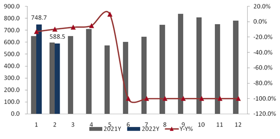 家電消費網4月1日訊    今天,我國大數據公司產業在線發布的2022年1-2月彩電數據顯示:彩電內銷出貨607萬臺,同比下滑6.0%;出口1322萬臺,同比增長5.8%。