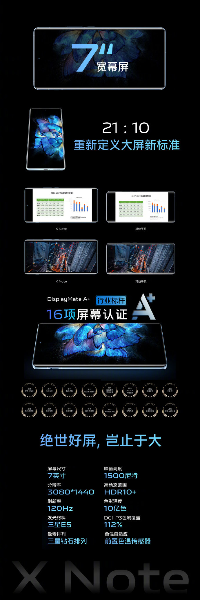 vivo X Note搭載高通驍龍8Gen1 SPU定制芯片和vivo自研V1芯片,采用7英寸寬幕屏,2K+ 分辨率的三星 AMOLED 曲面屏,120Hz 刷新率,支持 LTPO 自適應刷新率調節,240Hz 觸控采樣率,支持原生 10 億色色彩顯示,全場景 HDR 色彩,色準色偏精準調校,還有色溫自適應功能。屏幕覆蓋了康寧大猩猩 Victus 玻璃,耐刮擦耐摔。采用 3D 大面積超聲指紋解鎖,錄入速度超快,解鎖速度更快,還支持濕手解鎖。