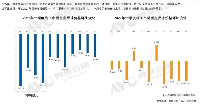 這是奧維云網日前發布的監測數據。成本壓力緩和后,彩電行業價格戰是否開啟?對此,奧維云網分析師表示,進入2022年,面板價格下降紅利逐步釋放,成本壓力緩和后,面對規模壓力,線上市場率先降價,主銷的中小尺寸降幅更加明顯;反觀線下市場價格小幅下調,且集中在75+,整體趨于穩定。